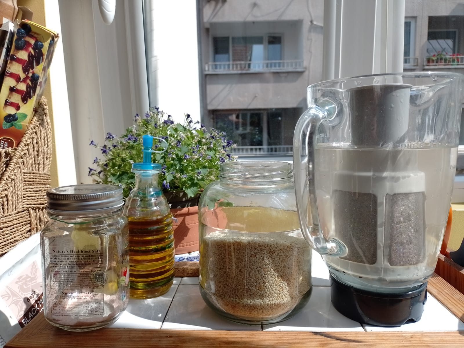 ingredients for sesame milk and the special blender with filter